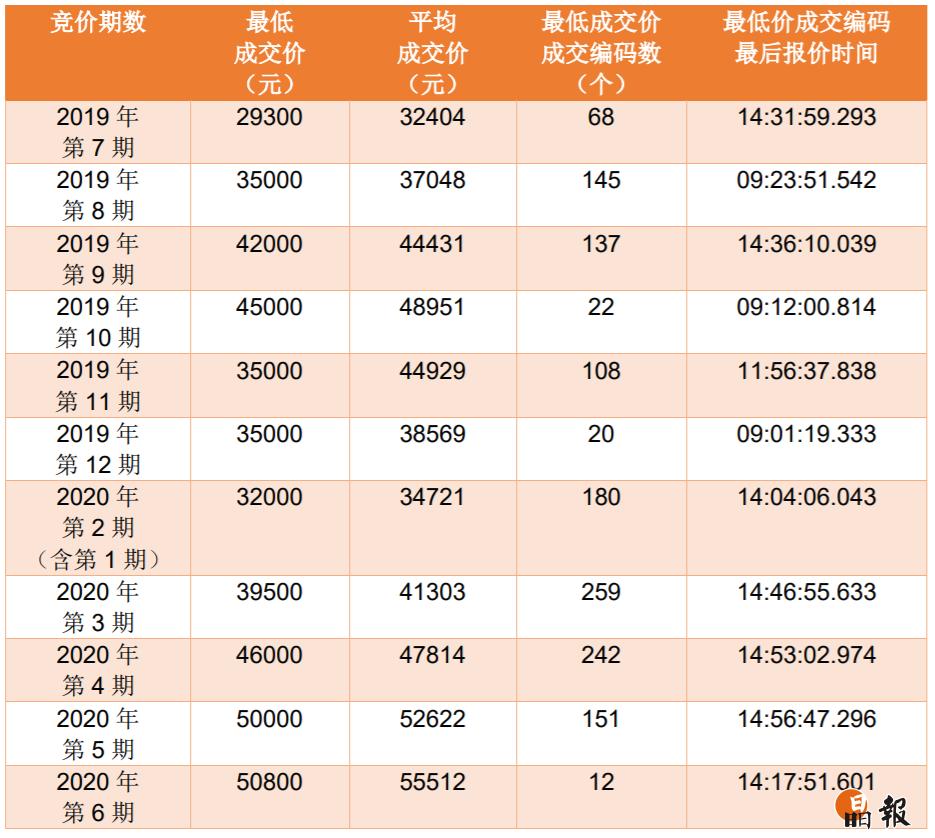 7月15日,2020年第7期普通小汽車(chē)增量指標(biāo)競(jìng)價(jià)公告發(fā)布,本期普通小汽車(chē)增量指標(biāo)共3346個(gè),其中個(gè)人指標(biāo)2945個(gè)。競(jìng)價(jià)時(shí)間定為7月27日9:00至15:00,連續(xù)進(jìn)行6個(gè)小時(shí),單位和個(gè)人在同一時(shí)間分別對(duì)相應(yīng)增量指標(biāo)進(jìn)行競(jìng)價(jià)。此前,第5期、第6期個(gè)人最低成交價(jià)均破5萬(wàn),創(chuàng)近一年新高。