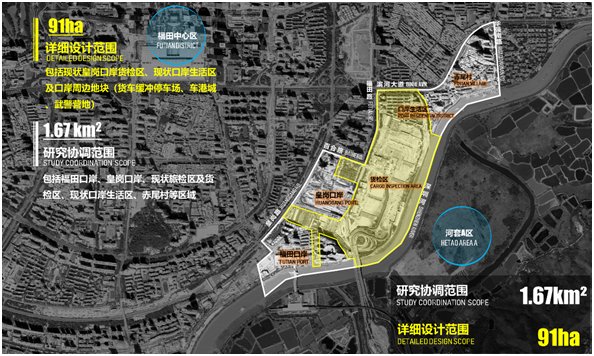 競賽由深圳市投資控股有限公司主辦,深港科技創(chuàng)新合作區(qū)發(fā)展有限公司承辦,深圳市規(guī)劃和自然資源局、深圳市建筑工務(wù)署、福田區(qū)人民政府為技術(shù)指導(dǎo)單位,旨在落實(shí)關(guān)于皇崗口岸片區(qū)遴選國際一流設(shè)計(jì)師進(jìn)行整體設(shè)計(jì)、統(tǒng)一開發(fā)、連片建造的要求,通過“定向邀請5家+資格預(yù)審10家”的方式,遴選了15家國際知名設(shè)計(jì)機(jī)構(gòu)參賽。其中,詳細(xì)設(shè)計(jì)范圍包括現(xiàn)狀皇崗口岸貨檢區(qū)、口岸生活區(qū)及口岸周邊地塊,面積約0.91平方公里;研究協(xié)調(diào)范圍為河套C區(qū),包括詳細(xì)設(shè)計(jì)范圍及周邊的福田口岸、赤尾村等區(qū)域,面積1.67平方公里。