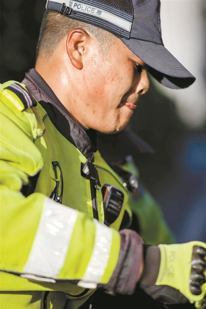“深圳最近的天氣太熱了,到了中午,地面溫度估計(jì)得有40℃了,我們因?yàn)榇髦谡?,外頭還得加上頭盔,感覺(jué)確實(shí)挺難受的。”深圳交警南山大隊(duì)機(jī)訓(xùn)中隊(duì)的鐵騎小哥時(shí)云財(cái),每天早高峰開(kāi)始就駕駛鐵騎穿梭在大街小巷,直到中午太陽(yáng)最盛的時(shí)候。摘下頭盔,眼睫毛上都是汗滴,更不用說(shuō)脫下熒光黃的制服,里面是層層疊疊早已被浸透發(fā)白的衣衫。