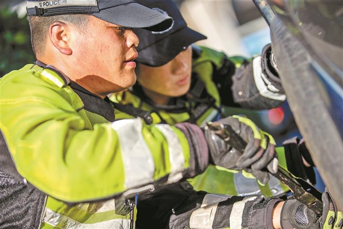 時(shí)云財(cái)和同事馬上幫助陳先生從車(chē)后備箱拿出換胎工具和備胎,在保證安全的前提下,僅用10分鐘就更換好輪胎?!疤兄x你們了,深圳交警‘小黃人’真的是我們最信任的人,有你們?cè)谖矣X(jué)得上路開(kāi)車(chē)就很放心。”陳先生不住地感謝、稱贊交警鐵騎小哥。