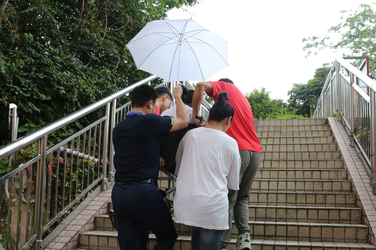 東升學??键c有一位行動不便的考生,學校派三名工作人員提前護送考生到考場。 (記者李麗