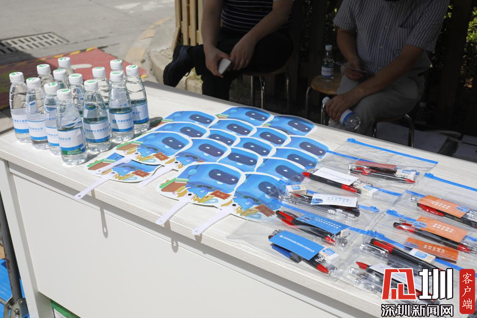 為考生和門口等待的家長準(zhǔn)備的文具包、風(fēng)扇和水。