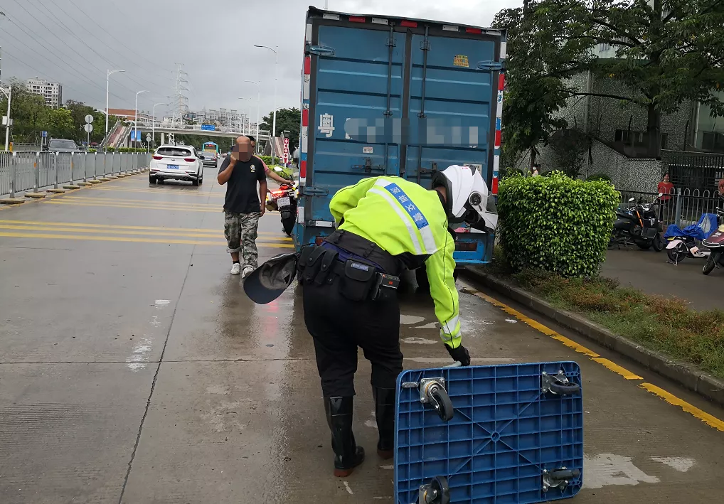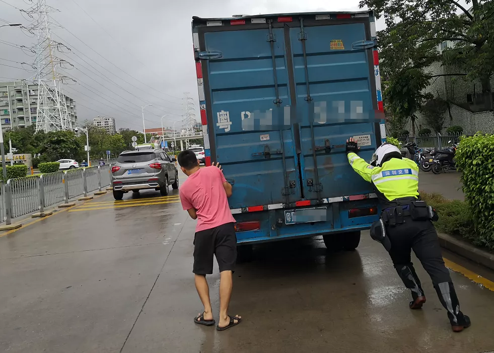8月5日9時(shí)30分許,深圳交警鐵騎隊(duì)員雨中巡邏至新沙路時(shí),發(fā)現(xiàn)德昌電機(jī)廠路段有一輛貨車停在路上,導(dǎo)致交通擁堵。貨車司機(jī)在旁,鐵騎上前詢問(wèn)情況后得知貨車故障,司機(jī)被迫將車停在路邊。