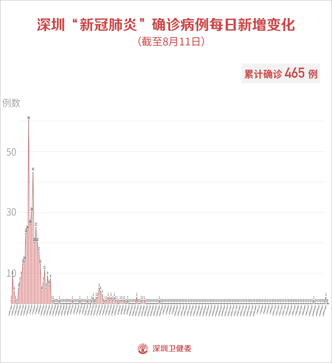 截至8月11日24時(shí),深圳市累計(jì)報(bào)告新冠肺炎確診病例465例。目前在院3例。