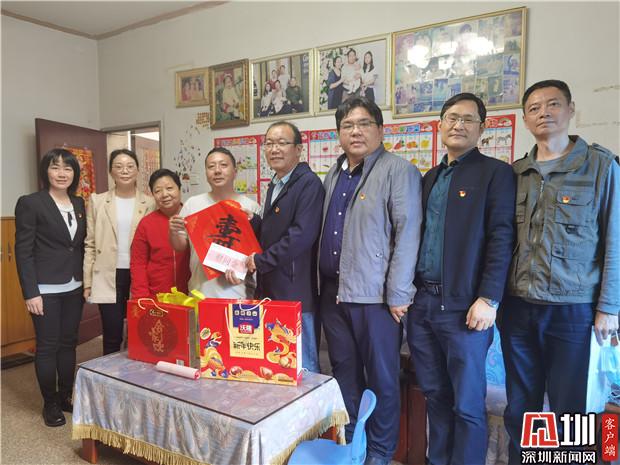 隨后,陳鵬、藍岸率領(lǐng)報業(yè)集團紀檢監(jiān)察室黨支部、深圳新聞網(wǎng)黨總支部黨員代表,在清水河街道黨工委副書記劉曉春、街道四級調(diào)研員陳小龍、梅園社區(qū)黨委書記曾建輝、副書記陳秋珊等人的陪同下,對梅園社區(qū)抗疫先鋒黨員、單親婦女、困難居民、殘疾人士進行分組探訪慰問并送上新春祝福。大家?guī)厦篮玫淖8!⑾矐c的春聯(lián)、慰問金、臘腸等慰問品,分四組慰問走訪。