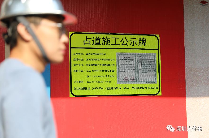 3月9日,我們?cè)邴}田區(qū)卓越榮津瀚海灣名庭施工現(xiàn)場(chǎng)看到,圍欄外每隔50米就張貼了最新版的占道施工公示牌,且在便于行人查閱的顯眼位置。