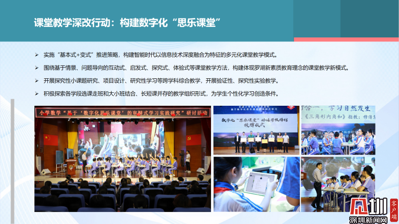 羅湖區(qū)推出的數(shù)字化“思樂課堂”相關課題,2020年被《中國教師報》認定為中國教育課堂改革十大樣本?!八紭氛n堂”充分發(fā)揮數(shù)字技術,提升課堂的邏輯性、趣味性、交互性、有效性,從而有效激發(fā)學生的學習潛能,使得深度學習在課堂中真實發(fā)生。目前,這種模式影響力也在不斷擴大,走向全國。4月8日,深圳市錦田小學、布心小學與來自陜西、江西的學校締結了數(shù)字化“思樂課堂”姊妹學校。近期,第二批數(shù)字化“思樂課堂”的學校和教師加入這個課改項目。