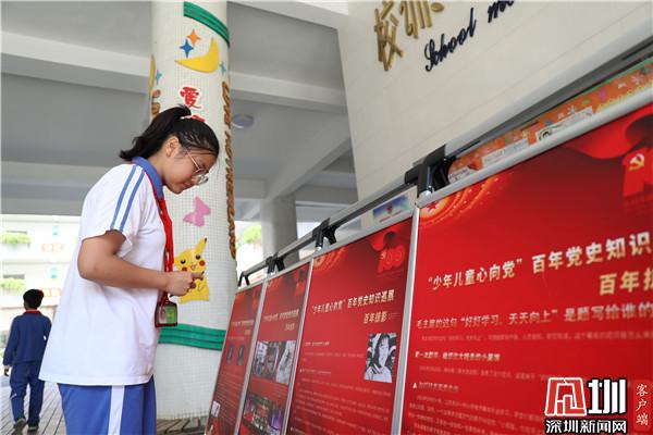記者首先來到羅湖區(qū)翠北實驗小學,主題展板位于學校一樓大廳,有很多同學會在下課的時間來這里觀看學習。學校社工邱女士參與設計本次活動的時候想到,黨史對孩子們比較遙遠,想要讓孩子們深入學習就不能用大人的方式死板教條的灌輸,要調(diào)動孩子們的積極性,讓孩子們自己做“小講師”。