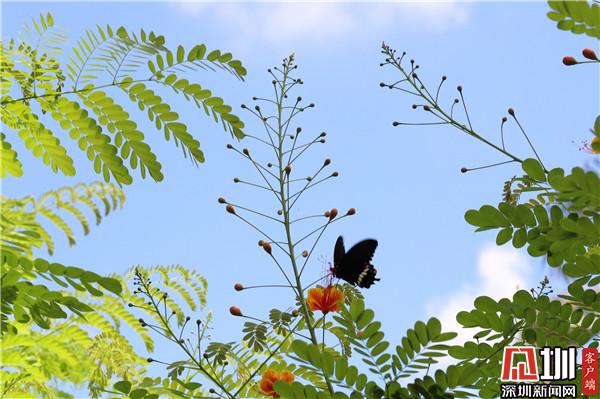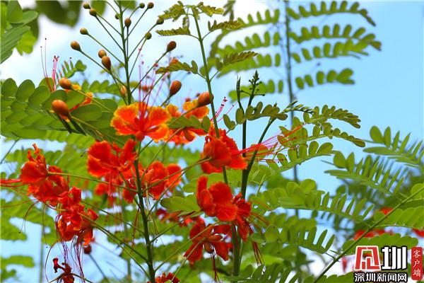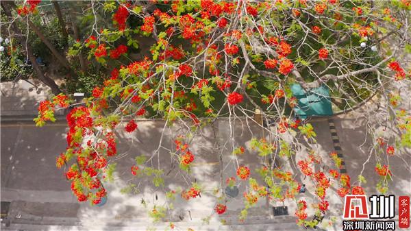 五月綻放全城的鳳凰花,映射著深圳這座城市的繁華與熱情,同時也給這座城市帶來勇敢熱烈的色彩。從鏡頭中可見,鳳凰花花團(tuán)緊簇,在藍(lán)天的襯托下,那一簇簇火紅的花海張揚(yáng)而又高調(diào)地綻放,為深圳“藍(lán)”染上了一抹紅。