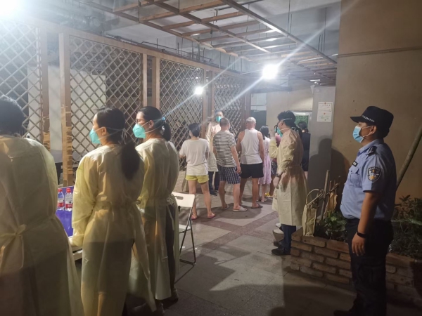 “我們已經(jīng)協(xié)調(diào)社康開(kāi)始發(fā)號(hào)了,不要急,請(qǐng)耐心等待?!惫S崗社康外,一名民警正頂著烈日揮汗如雨,耐心地給居民進(jìn)行解釋,警服肩頸處可見(jiàn)一道道汗?jié)n。