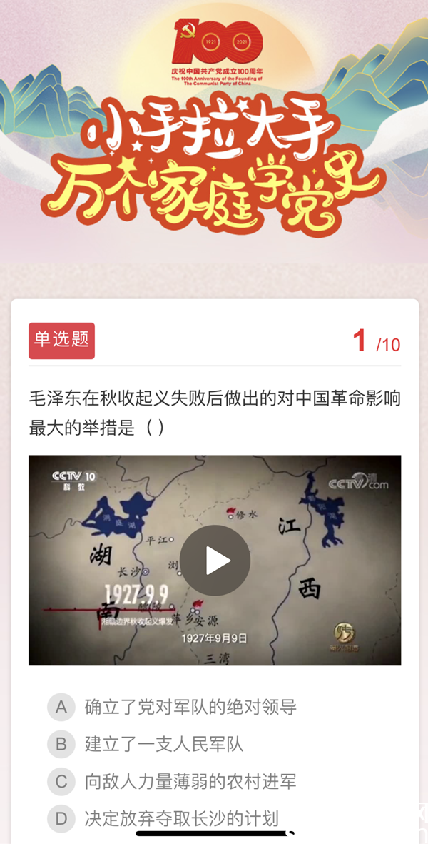 此次羅湖區(qū)率先通過區(qū)級融媒客戶端創(chuàng)新推出黨史學(xué)習(xí)教育“親子學(xué)習(xí)”模式,學(xué)生及家長共同參加,將黨史學(xué)習(xí)和家庭教育結(jié)合。題目類型上創(chuàng)新“圖+文+影”多種形式,包括看圖文答題,觀看革命題材電影片段等,題目內(nèi)容涵蓋黨史、新中國史、創(chuàng)建文明城市等。