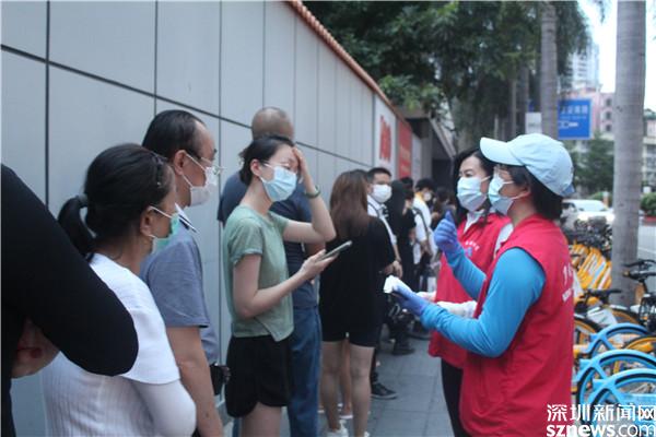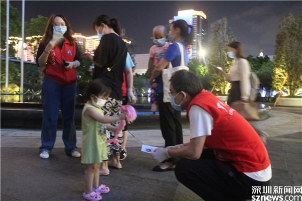 最早到達老圍社區(qū)的下沉干部是羅湖區(qū)財政局副局長朱健全,他一來就遇到了核酸檢測,跟社區(qū)工作人員一起布置檢測現(xiàn)場,協(xié)助居民登記健康碼、出示行程碼。有居民帶著孩子來做檢測,他又臨時當(dāng)起了保育員,以便孩子的媽媽順利檢測。身穿紅馬甲的他看起來就是一個經(jīng)驗豐富極富愛心的義工。