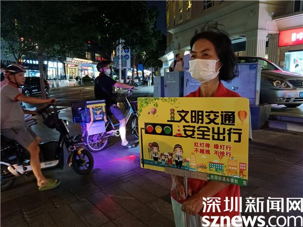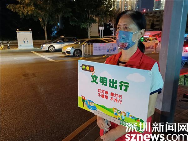 另一位堅(jiān)守在國(guó)慶假期里的義工是宣仲英,今年62歲。她一站兩個(gè)小時(shí),始終是精神抖擻,毫不松懈??吹接腥嗽噲D闖紅燈,她及時(shí)制止??吹接腥瞬蛔甙唏R線,她立刻提醒。她手持勸導(dǎo)文明出行的牌子,就像個(gè)交通警察,誰(shuí)也別想在她的面前犯規(guī)。本來(lái)下午6點(diǎn)鐘,正是她給家人做晚餐,同家人一起吃飯的時(shí)間,但她聽說(shuō)社區(qū)創(chuàng)文需要人,就跟家人商量,得到了家人的一致同意。她說(shuō),“我從內(nèi)地來(lái)到深圳,在老圍社區(qū)住了10年,感覺深圳做義工的氛圍特別濃厚,我也想做義工,為社會(huì)發(fā)揮余熱。”