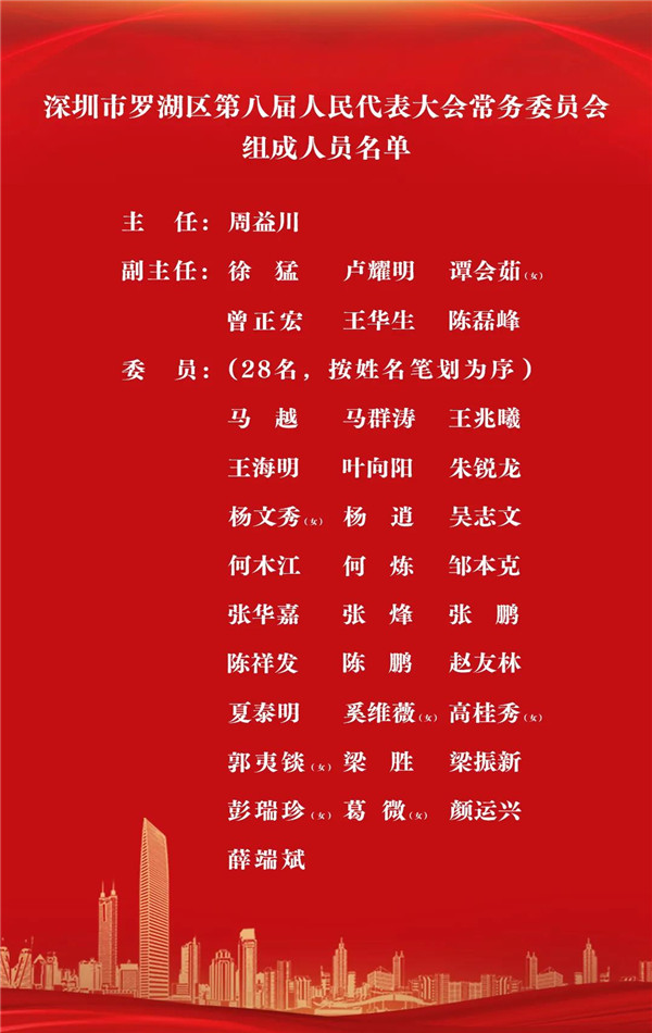 經(jīng)會議選舉,周益川當(dāng)選羅湖區(qū)第八屆人大常委會主任,范德繁當(dāng)選羅湖區(qū)人民政府區(qū)長,姚文勝當(dāng)選羅湖區(qū)監(jiān)察委員會主任。徐猛、盧耀明、譚會茹、曾正宏、王華生、陳磊峰當(dāng)選羅湖區(qū)第八屆人大常委會副主任。左金平、夏東、于紅軍、馮健、肖嘉睿、詹輝、霍廣勇當(dāng)選羅湖區(qū)人民政府副區(qū)長。楊爽當(dāng)選羅湖區(qū)人民法院院長。張彬當(dāng)選羅湖區(qū)人民檢察院檢察長,根據(jù)法律規(guī)定,須報經(jīng)市人民檢察院檢察長提請市人大常委會批準(zhǔn)。獲頒當(dāng)選證書后,新當(dāng)選人員向憲法宣誓就職。