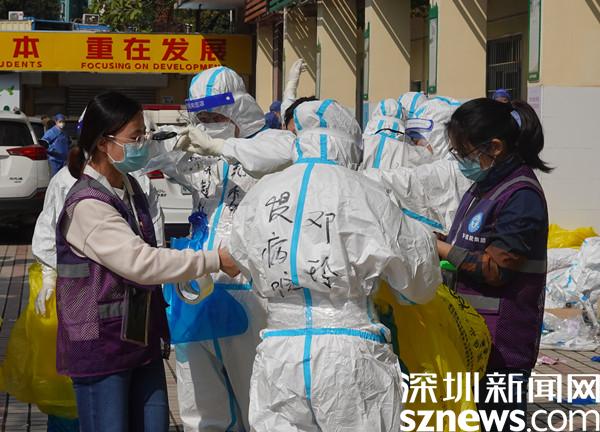 讀特客戶端·深圳新聞網(wǎng)2022年1月11日訊(記者 劉嘉敏 通訊員 劉嘉麗)“來(lái),我?guī)湍愫竺娴氖痔缀匈N好!”“誒,你看看我的回收袋有沒(méi)有粘牢?”……1月11日,在深圳市新華外國(guó)語(yǔ)學(xué)校,一群準(zhǔn)備集結(jié)出發(fā)的核酸采樣工作人員正在相互幫忙穿戴防護(hù)服。區(qū)別于普通的防護(hù)服,他們將酒精、手套、回收袋等用膠帶粘在腰間,這是基于封控區(qū)核酸采樣工作的特殊性,大家想出的奇招。