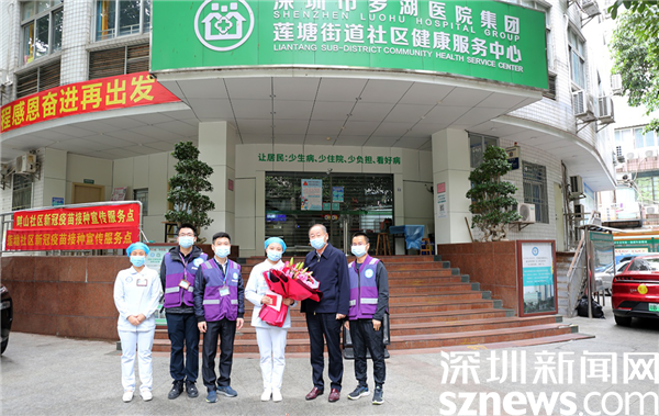 1月13日是王津原定舉行婚禮的日期,她仍然沒有例外地出現(xiàn)在蓮塘社康的采樣隊伍中。盡管不能出現(xiàn)在婚宴現(xiàn)場,但是并肩作戰(zhàn)的社康同事給王津錄了一個祝福視頻給她祝賀,羅湖醫(yī)院集團黨委書記、院長孫喜琢也來到蓮塘社康,向依然堅守崗位的新娘王津送上了鮮花和新婚祝福,感謝她的辛勤付出,并對所有在抗疫一線的醫(yī)務工作者表示感謝,“是你們在守護羅湖、守護深圳的安全,你們辛苦了!”