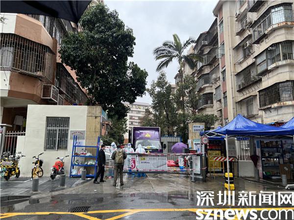 2月22日早上,記者來到處于管控區(qū)域的桂園街道鹿苑小區(qū)。只見身穿防護(hù)服的“大白”們來來往往地在門口忙碌著,偶爾有外賣小哥將外賣放在小區(qū)入口的貨架上便離開,雨水打濕了門前拉起的紅色警戒線。鹿丹村社區(qū)黨委書記陳姍姍披著簡單的一次性雨衣,不斷響起的電話,居民的一聲聲詢問,都是她需要盡快處理的各項管控工作。