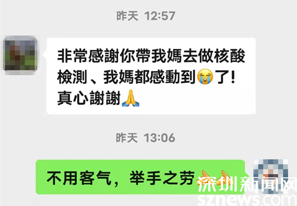 聽說深圳疫情嚴(yán)峻,李曉萍已經(jīng)幾天沒有出門,想去做核酸檢測(cè),又不會(huì)操作。她在香港的兒子也十分擔(dān)憂,卻無能為力。劉珍蓮主動(dòng)提出陪老人去做核酸檢測(cè),老人很開心,跟著劉珍蓮來到核酸檢測(cè)點(diǎn),劉珍蓮幫她實(shí)名驗(yàn)證,幫她調(diào)出粵核酸碼,她采樣時(shí),劉珍蓮在一旁守候。此情此景讓老人激動(dòng)不已,就出現(xiàn)了開頭的一幕。