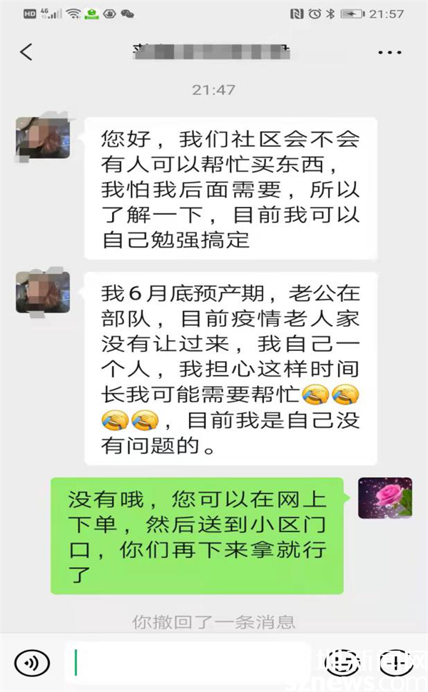 3月13日晚近十點(diǎn),家住蓮塘街道蓮馨家園的黃女士通過微信向畔山社區(qū)黨委副書記鄒紅梅求助,詢問社區(qū)能否在自己待產(chǎn)不方便的情況下幫助購物送貨……。原來,黃女士預(yù)產(chǎn)期在6月份,丈夫在部隊(duì)服役,因?yàn)橐咔樵?,家中老人無法過來深圳照顧,只能自己在家休養(yǎng),心理壓力較大顧慮較多。了解到情況后,鄒紅梅耐心疏導(dǎo)黃女士焦慮和恐慌情緒,說明社區(qū)的關(guān)愛措施,并微信回復(fù)說,“需要幫忙,可以找我們。放心吧,有我們?cè)?。?/p>