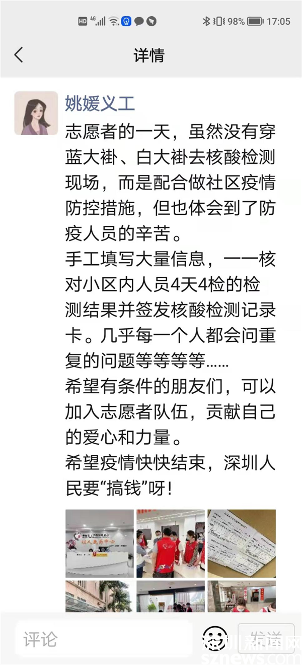 她在朋友圈呼吁:“希望有條件的朋友們,可以加入志愿者隊伍,貢獻(xiàn)自己的愛心和力量?!彼f,她所供職的優(yōu)合集團(tuán)已經(jīng)組織了122人的志愿隊伍,分布在全市各區(qū),奮力投身全市抗疫戰(zhàn)斗。雖然做志愿者很辛苦,但她不忘調(diào)侃:希望疫情快快結(jié)束,深圳人民要“搞錢”呀!