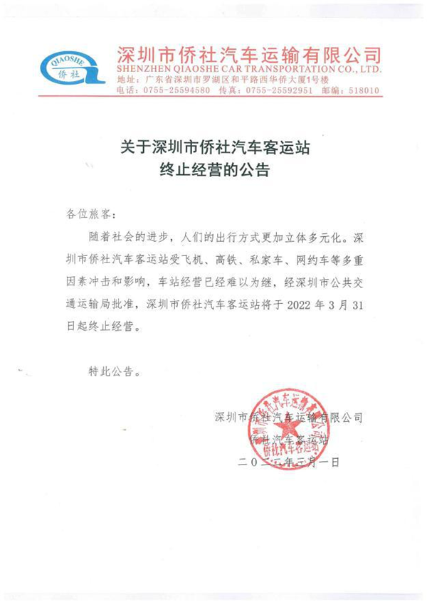 近年來(lái),隨著國(guó)家經(jīng)濟(jì)社會(huì)的發(fā)展,人們的生活日新月異,大家的出行方式日趨呈現(xiàn)多元化,汽車(chē)客運(yùn)站承載的長(zhǎng)途客運(yùn)服務(wù)功能逐漸被削弱。據(jù)深圳市交通運(yùn)輸局羅湖管理局相關(guān)負(fù)責(zé)人介紹,近兩年來(lái),在新冠肺炎疫情沖擊下,僑社客運(yùn)站日均發(fā)送旅客寥寥無(wú)幾,客運(yùn)站經(jīng)營(yíng)難以為繼,無(wú)奈之下決定終止經(jīng)營(yíng)。