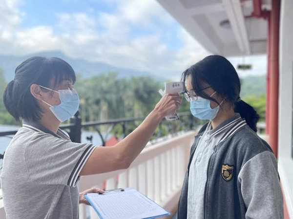 返校情意切,防疫當居先。校門口,入校流程清晰明確,所有返校學生間隔一米有序排隊,經(jīng)過物品消毒、手部消毒、口罩更換,進入緩沖區(qū),測溫查碼、核驗資料進入校園。申清翠校長帶領學校全體行政團隊全程把關,堅守崗位,確保學生們健康、安全進入校園。