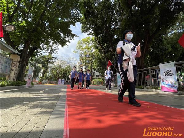 藍天白云下,背著書包的莘莘學子走上紅毯,一旁的幕布寫著偌大的八個字:羅湖實驗、歡迎回家。深圳市羅湖實驗學校的返校頗具儀式感,校門口一席紅毯,校園欄桿彩旗飄飄,孩子們在一片喜氣洋洋的氛圍中回到學校。