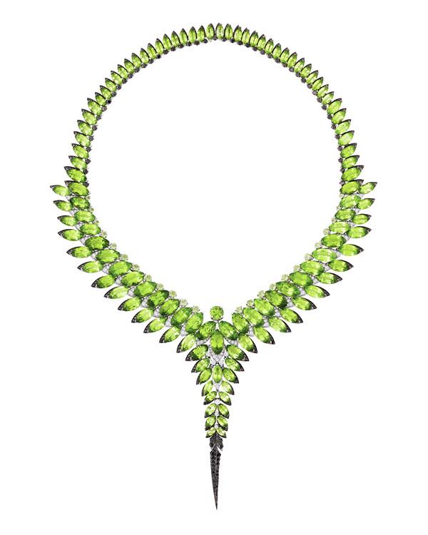 此外,橄欖石不僅是珠寶首飾材料,也可化身服裝、腕表及擺件的組成部分。乘著設(shè)計師、藝術(shù)家的無窮想象力,橄欖石與多媒介、多材質(zhì)相結(jié)合,碰撞出斑斕旖旎的時尚表達(dá)——讓這一抹鮮亮的綠色,成為游走于日常生活的獨特色彩。