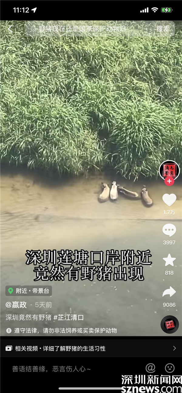 記者咨詢蓮塘街道和羅湖區(qū)城市管理綜合行政執(zhí)法局相關(guān)負(fù)責(zé)人表示,此次野豬出沒的地點(diǎn)的是在口岸對(duì)面,不屬于深圳管轄的范圍。此前,在仙湖植物園和梧桐山風(fēng)景區(qū)也頻現(xiàn)野豬身影。