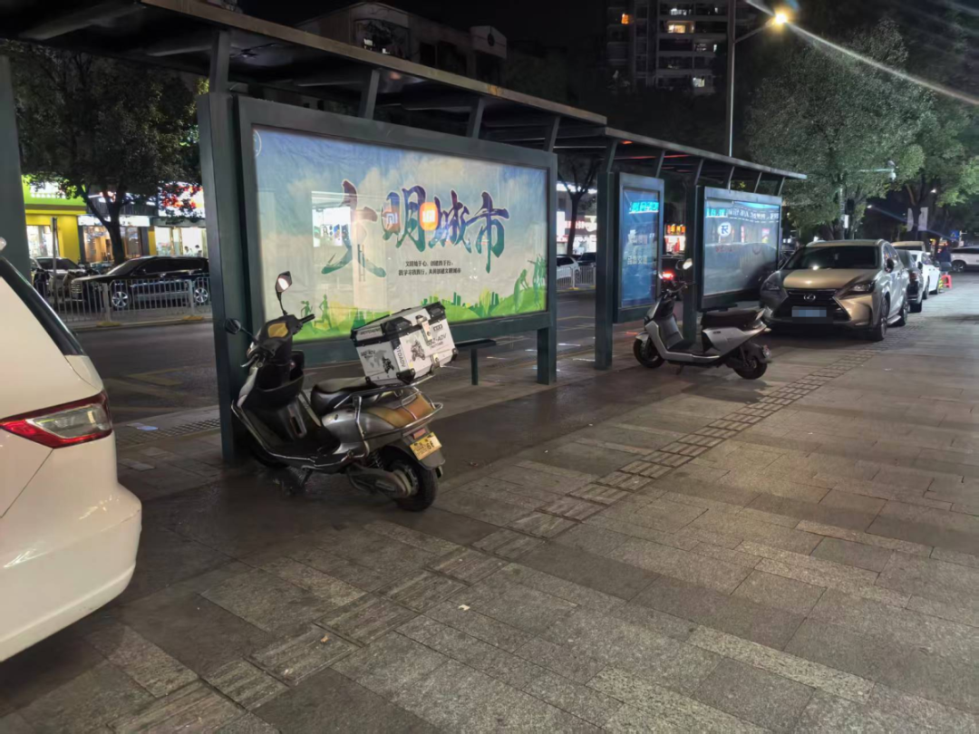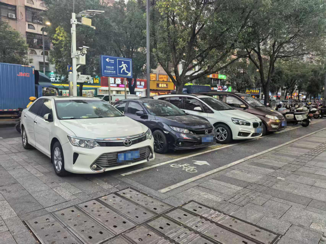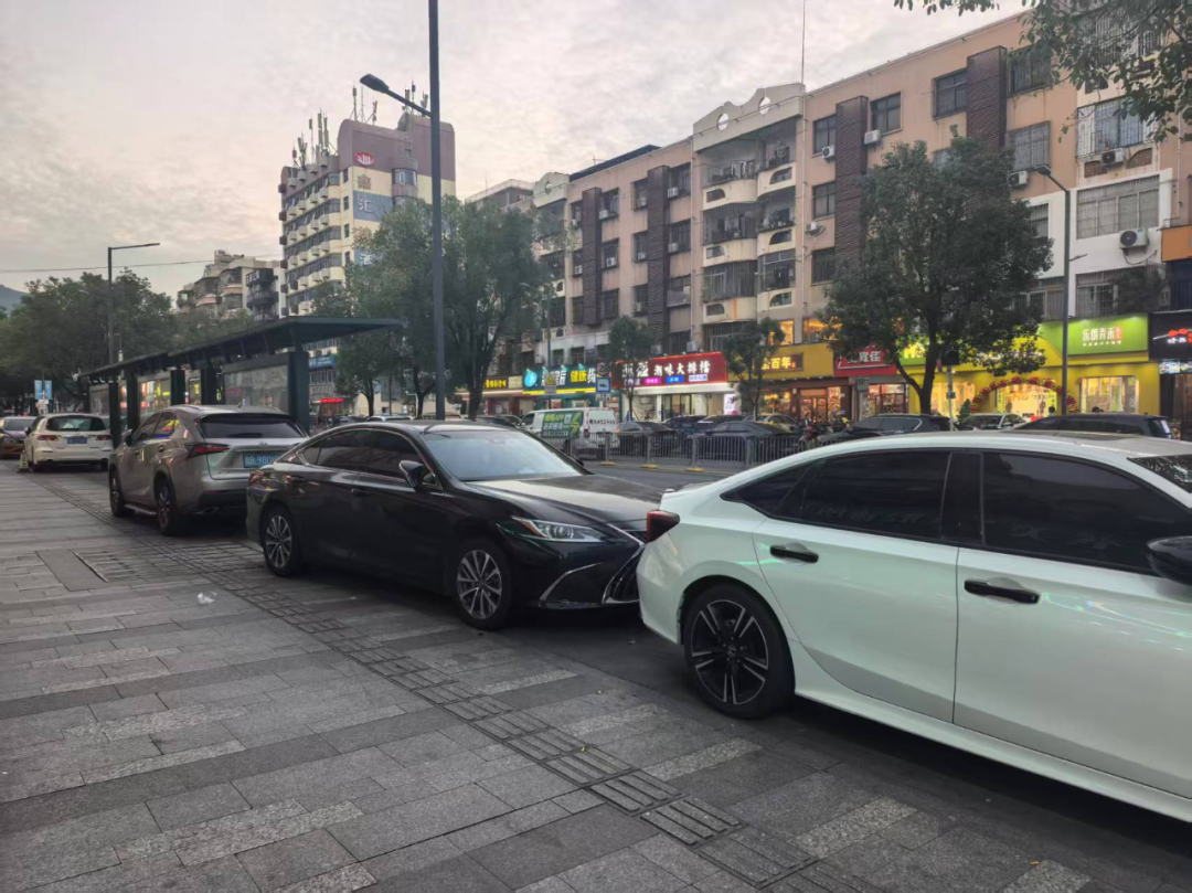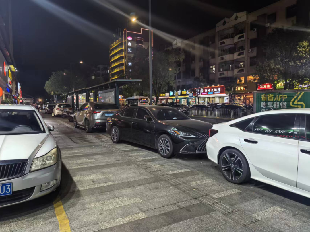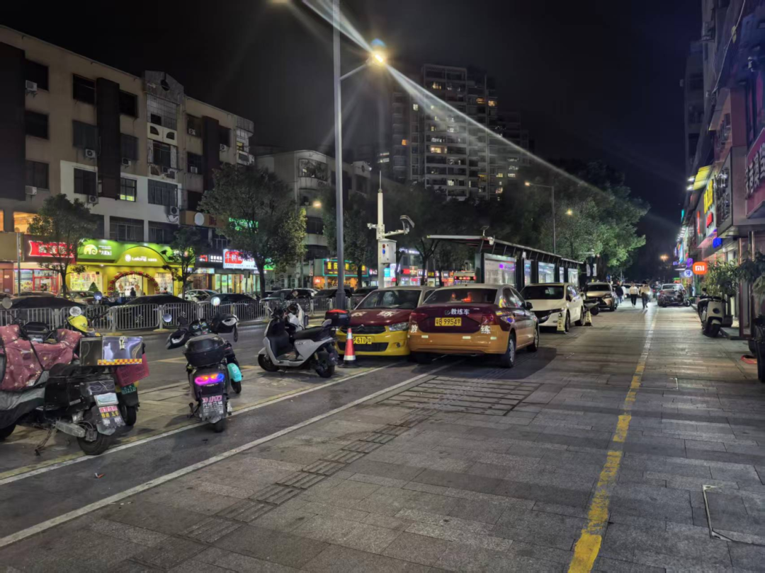 當(dāng)日夜間,記者再次重返現(xiàn)場,發(fā)現(xiàn)這些違停車輛均未駛離。原本寬敞的人行道在最窄處被壓縮成僅容兩人并行的狹窄通道,行人與非機(jī)動車混行現(xiàn)象突出,夜間視線不佳更放大了安全隱患。