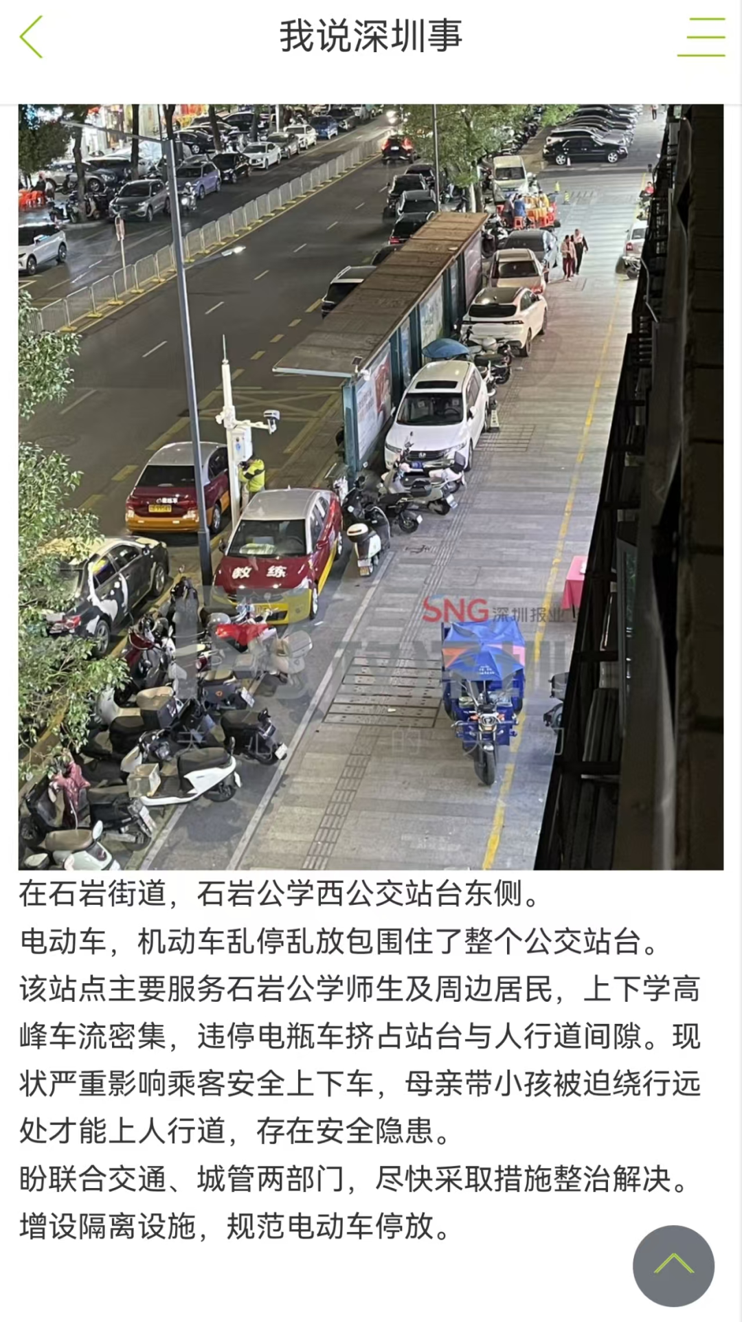 近日,有網(wǎng)友在《問政深圳》發(fā)帖稱,石巖街道石巖公學(xué)西公交站東側(cè)站臺存在違停車輛影響乘客出行情況。該網(wǎng)友表示,該站點機(jī)動車亂停放情況嚴(yán)重,甚至包圍住整個公交站臺,致使乘客只能被迫行走到機(jī)動車道繞行回人行道,存在一定安全隱患。