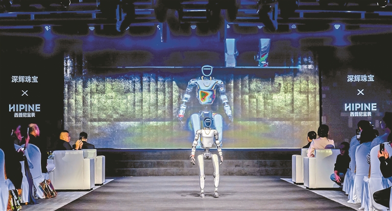 智能機(jī)器人佩戴璀璨珠寶走秀。 深圳特區(qū)報記者 賴?yán)?攝