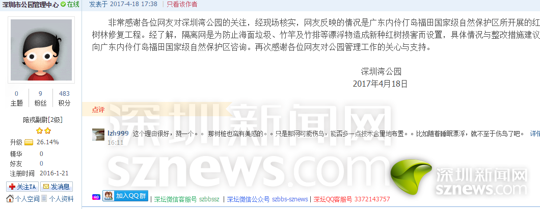 深圳灣公園在4月18日下午就網(wǎng)友質(zhì)疑,迅速在深圳論壇中回應(yīng)