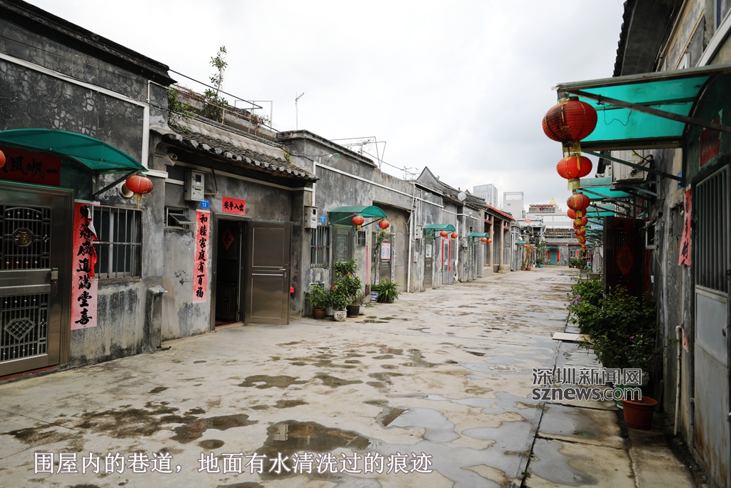 2017年8月的一天,深圳新聞網(wǎng)記者探訪西埔新居,在龍崗“三館一城(公共藝術(shù)館、科技館、青少年宮、圖書館)”的工地包圍中,我們從萬科天譽學校的側(cè)門,走過一段小路,終于看到一半月形的池塘,找到了西埔新居。一位老奶奶正在西埔新居前的空地散步,她指給我們進入新居的入口,正門兩側(cè)的對聯(lián)“堯天舜日,甘雨和風”頗具古風,又有天下情懷。