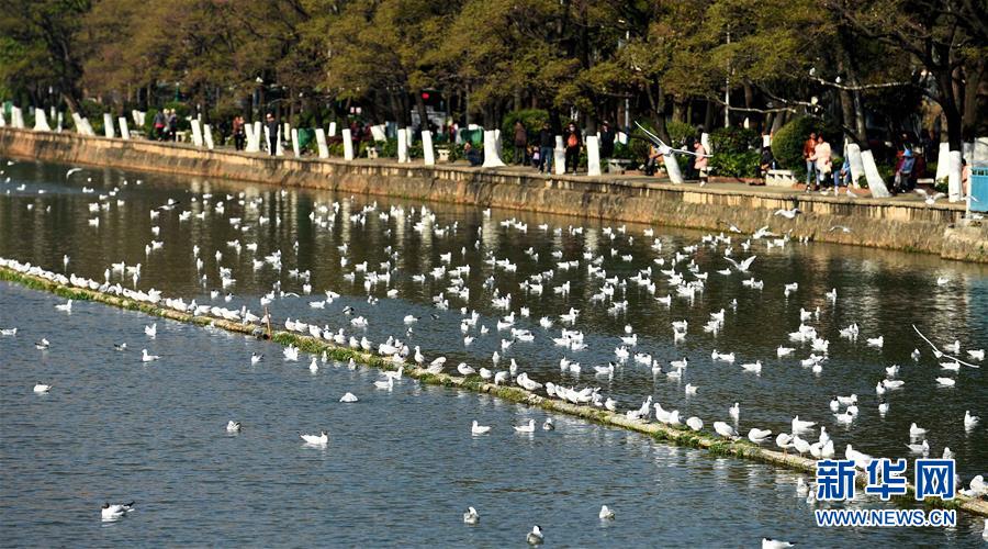 3月13日,即將返鄉(xiāng)的紅嘴鷗在昆明大觀河上嬉戲。 新華社記者藺以光攝