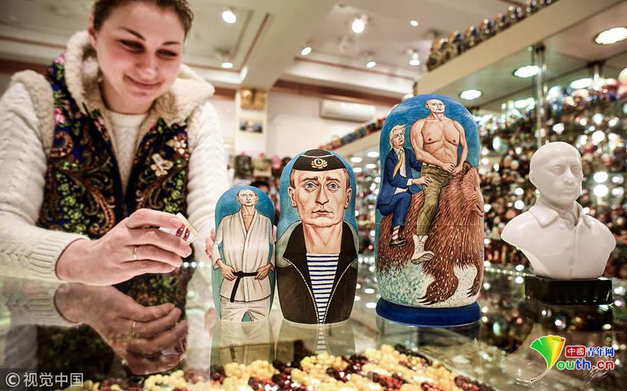 當(dāng)?shù)貢r間2018年3月13日,俄羅斯莫斯科,俄羅斯大選將于3月18日舉行,大選主題紀(jì)念品熱賣。