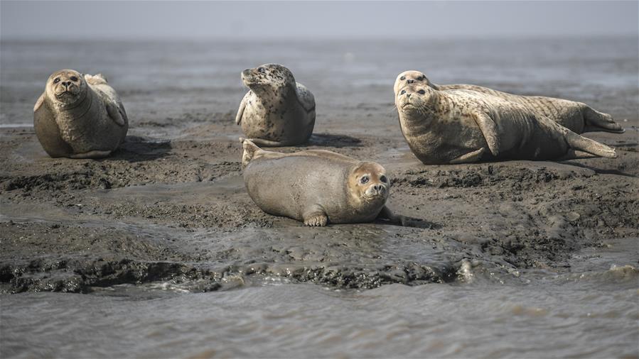 3月25日,幾只斑海豹在遼寧盤錦雙臺(tái)河口三道溝海域的灘涂上休息。新華社記者潘昱龍攝