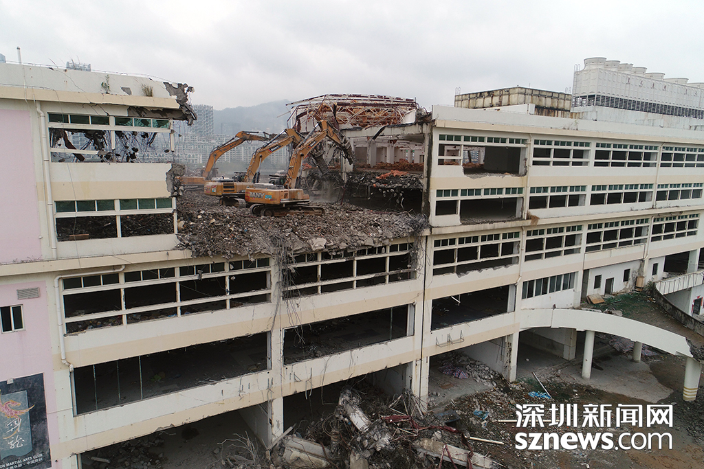 漁人碼頭拆除現(xiàn)場,原漁人碼頭水產(chǎn)交易市場的頂層已快拆除過半