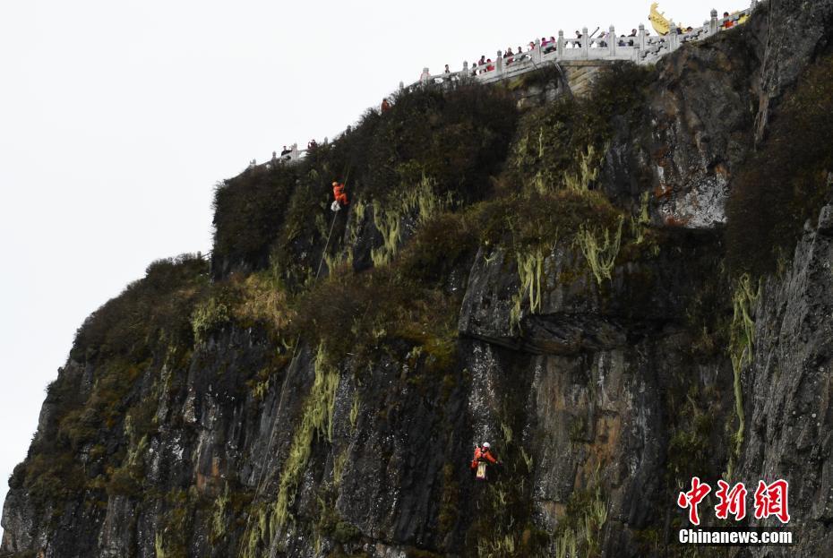5月1日,四川峨眉山,正在清理崖壁上垃圾的“蜘蛛人”。中新社記者 劉忠俊 攝