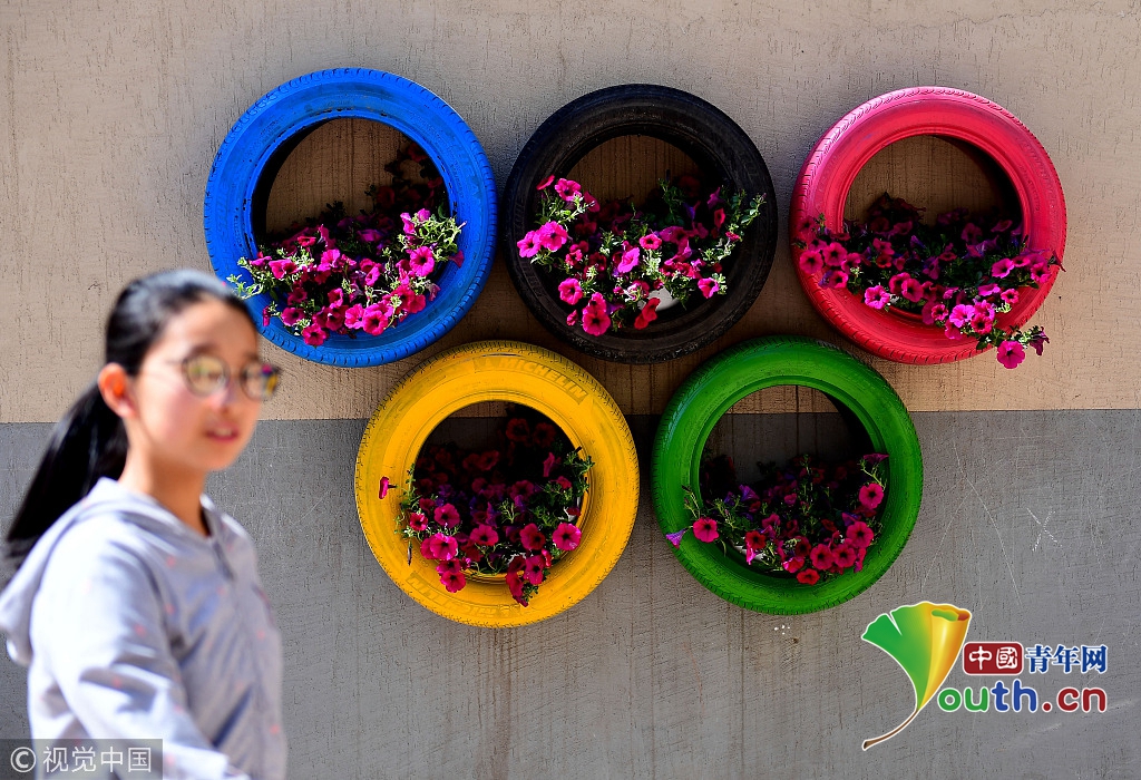 5月4日,二十余個(gè)印有卡通圖案及奧運(yùn)五環(huán)造型等創(chuàng)意輪胎花盆亮相沈陽,吸引市民。