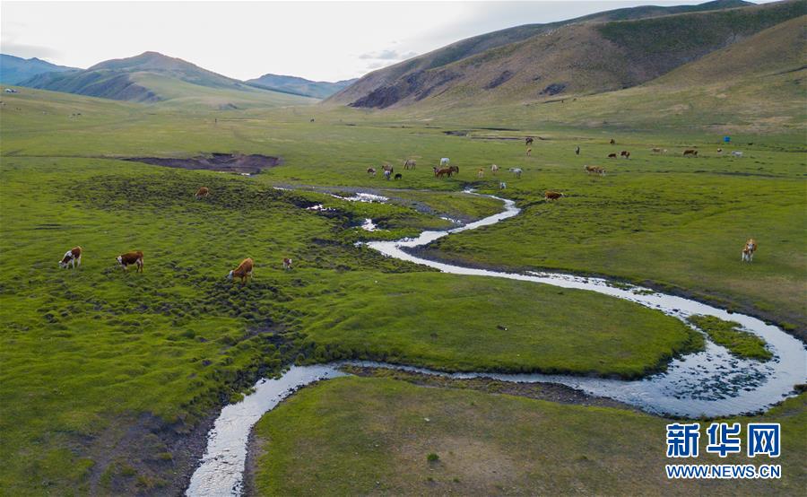 隨著氣溫回升、降雨量逐漸增多,內(nèi)蒙古草原開始進入全面返青期。新華社記者 彭源 攝