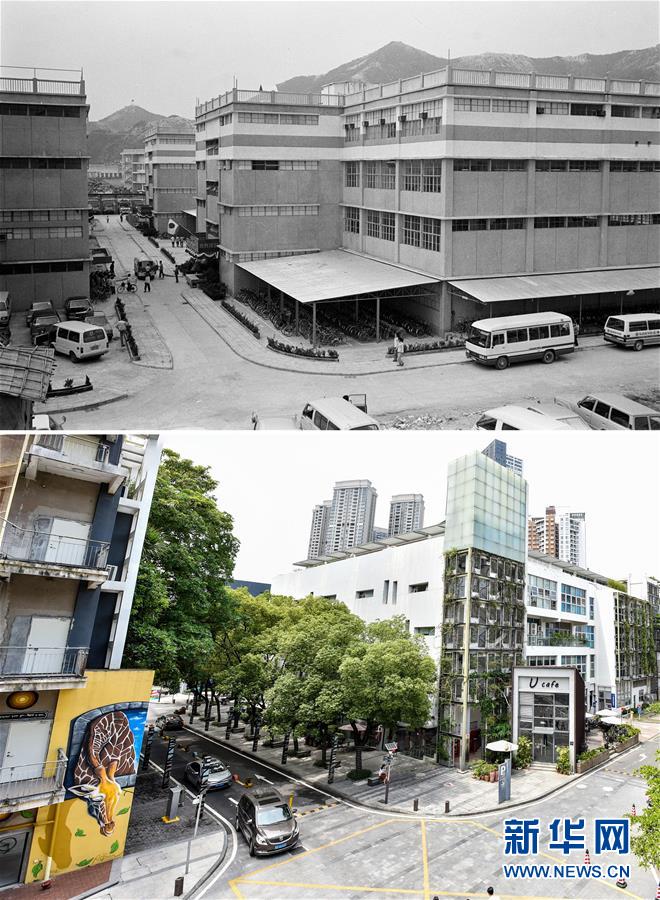 拼版照片:上圖為位于深圳蛇口工業(yè)區(qū)的三洋電機(jī)(蛇口)有限公司廠房外景(資料照片,新華社記者李長永攝);下圖為2018年6月20日拍攝的原三洋電機(jī)(蛇口)有限公司廠房(新華社記者毛思倩攝)。這些廠房已經(jīng)被打造成為南海意庫創(chuàng)意產(chǎn)業(yè)園,里面匯聚了咖啡館、服裝店、設(shè)計(jì)工作室等文創(chuàng)項(xiàng)目。新華社發(fā)