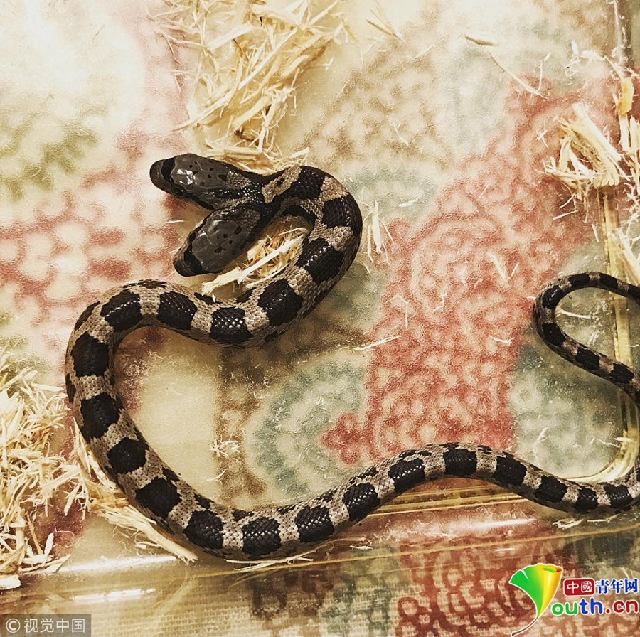 6月6日消息,在美國路易斯安那州新奧爾良,野生動物專家Tanee Janusz收養(yǎng)了同事在后院發(fā)現(xiàn)的一只雙頭錦蛇。據(jù)報道,該雙頭蛇由于基因缺陷而擁有兩只頭,概率僅有萬分之一,Tanee Janusz為兩只蛇頭分別起了名字,這對“雙胞胎”擁有不同的性格,經(jīng)常因為往哪走扭作一團。 圖片來源:視覺中國