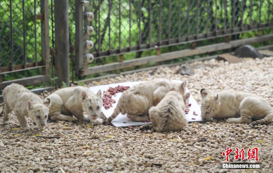 7月10日,雪虎五胞胎分享“肉餡蛋糕”。當日,濟南野生動物世界五胞胎雪虎誕生滿百日,正式與游客見面。中新社記者 張勇攝