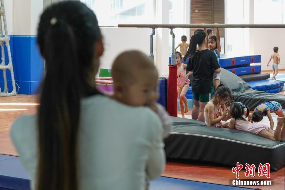 7月16日,貴州榕江,一位母親抱著孩子在訓(xùn)練室門外看著孩子們訓(xùn)練。位于月亮山深處的貴州省黔東南苗族侗族自治州榕江縣,數(shù)十年來堅持少年兒童體操培養(yǎng)、訓(xùn)練,對于全縣有良好身體條件的少年兒童進(jìn)行免費(fèi)集中培訓(xùn)。目前該縣每年有60余名兒童在業(yè)余體操運(yùn)動學(xué)校進(jìn)行訓(xùn)練。炎炎夏日,孩子們不懼酷暑,刻苦訓(xùn)練追尋著自己的“體操夢”。據(jù)了解,自1972年以來,榕江縣先后向貴州省體操隊、蹦床隊輸送了21名運(yùn)動員;其中有6名運(yùn)動員進(jìn)入國家體操隊,10名運(yùn)動員榮獲“國家健將級運(yùn)動員”稱號,5名運(yùn)動員榮獲“國際健將級運(yùn)動員”稱號,其中體操名將劉榕冰是2014年體操世錦賽男團(tuán)冠軍成員之一。2004年,榕江縣被貴州省體育局授予“貴州體操之鄉(xiāng)”稱號。中新社記者賀俊怡 攝