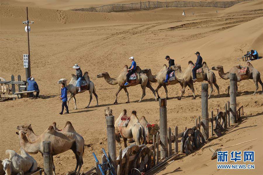 7月21日,在內(nèi)蒙古庫(kù)布其沙漠響沙灣景區(qū),游客體驗(yàn)騎駱駝。