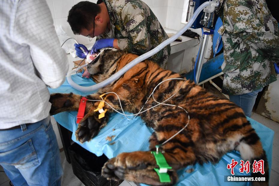 8月9日,位于昆明的云南野生動物園獸醫(yī)通過呼吸麻醉的方式,為園中一只一歲的老虎清潔牙。 中新社記者 劉冉陽 攝
