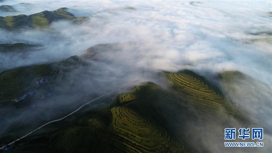 云霧繚繞的寧夏彭陽縣金雞坪梯田公園(7月17日無人機拍攝)。 新華社記者 王鵬 攝