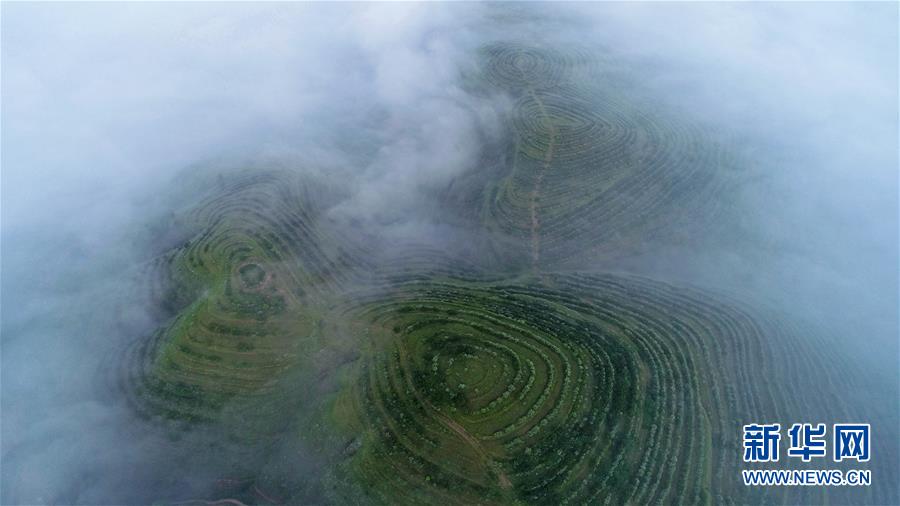 云霧繚繞的寧夏彭陽(yáng)縣金雞坪梯田公園(7月17日無人機(jī)拍攝)。 新華社記者 王鵬 攝