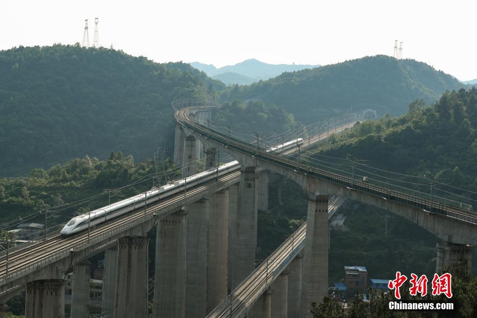 5月16日,一列動(dòng)車從貴陽(yáng)市郊交織的橋梁上駛過(guò)。貴州省地處中國(guó)西南腹地,高原山地居多,因此高鐵建設(shè)的橋隧占比較高。在貴陽(yáng)市烏當(dāng)區(qū)新添寨,高鐵滬昆線、貴廣客運(yùn)專線、貴開城際客運(yùn)專線的隧道和橋梁交織在一起,形成“五洞五橋”并行。中新社記者賀俊怡 攝